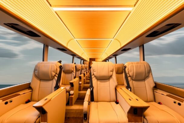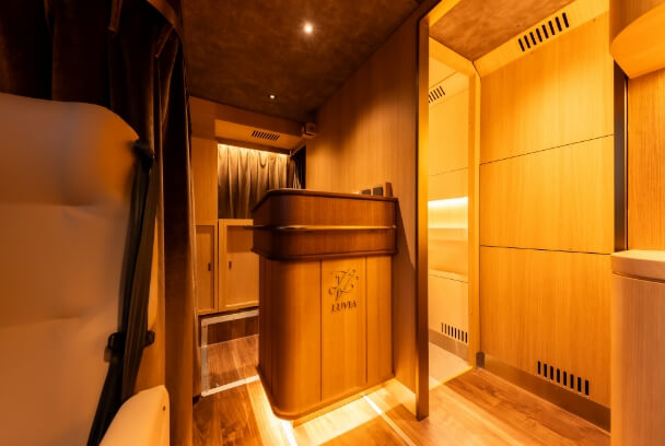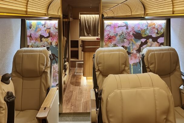 「遊山-yusan-」の旅のために、既成のバスの概念を超えるような車両を、多様な商空間のプロデュースに強みを持つ㈱スペースとともに作り上げました。心地よく、ゆったりとくつろげるような空間づくりにこだわるとともに、USBポートやスマホホルダーなど、快適に過ごすための設備も採用しました。特別な旅を、特別な車両でご案内します。