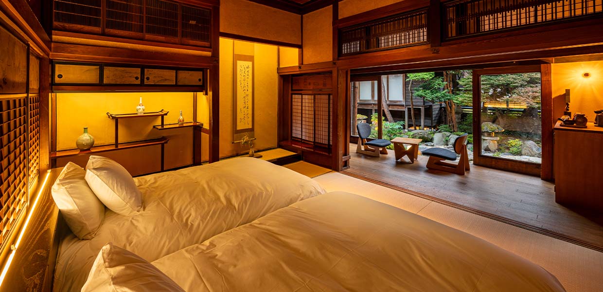 百五号室【御座敷の贅沢さ】 :45m²、 ダブルベッド二台、中庭+露天風呂付き(2名1室のみ)