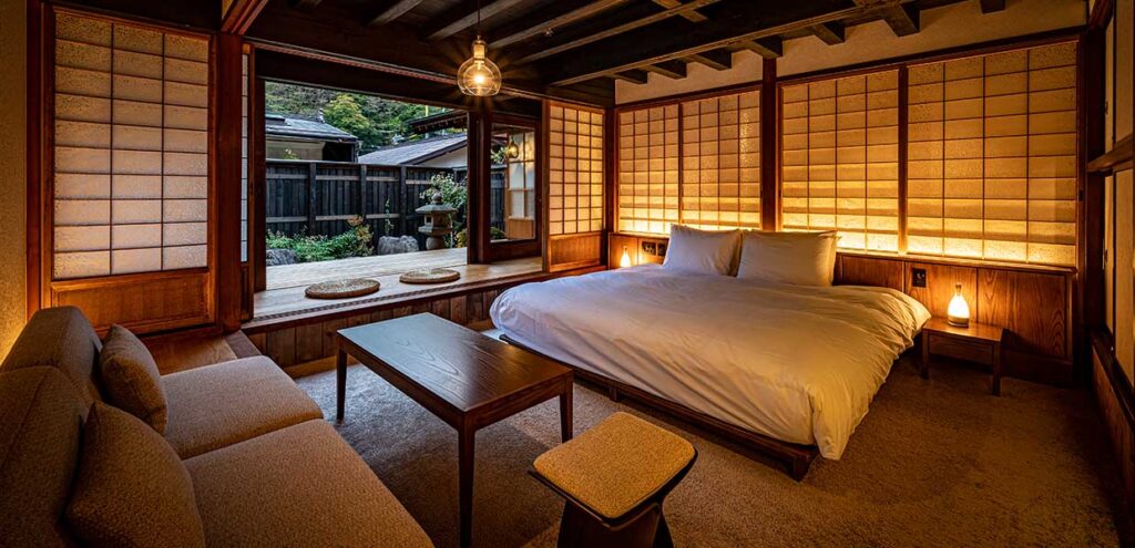 百六号室:52m²、キングベッド一台、布団二組、露天風呂付き(2~4名1室)