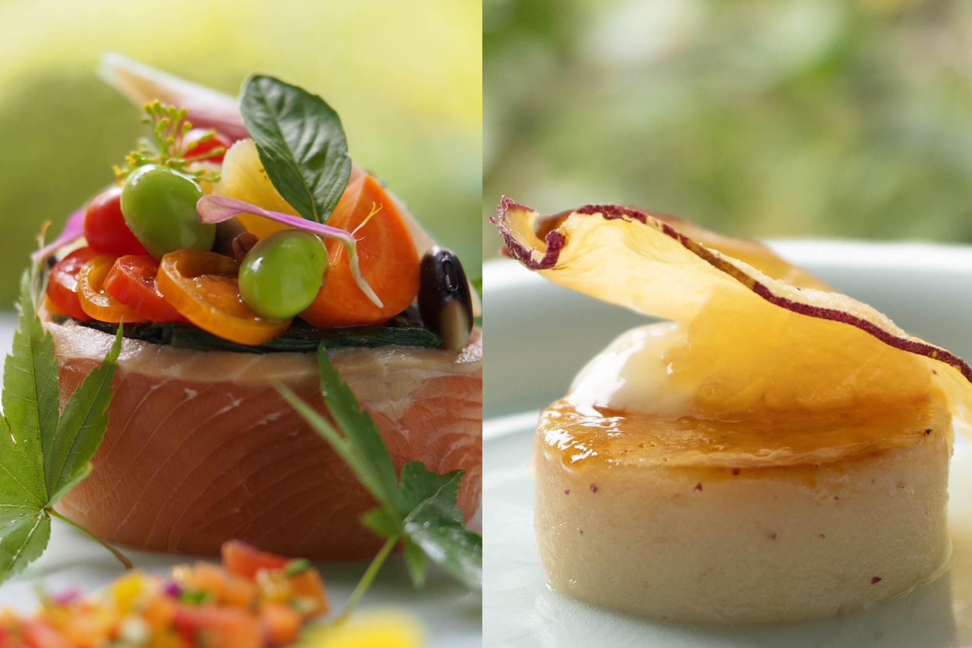湖香(うか)という読み方は穀物の神様「ウカノミタマノカミ」からいただいています。地元食材を最大限に生かしたお料理をお楽しみください(写真の料理は一例です)。