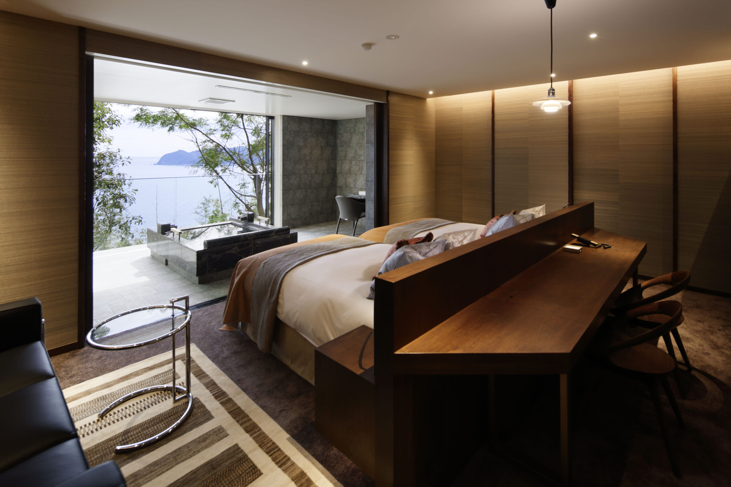 テラスにはデイベッドが置かれ、温泉で火照った身体を癒すことができます。海をより近くに感じられ、開放感あふれる客室です。