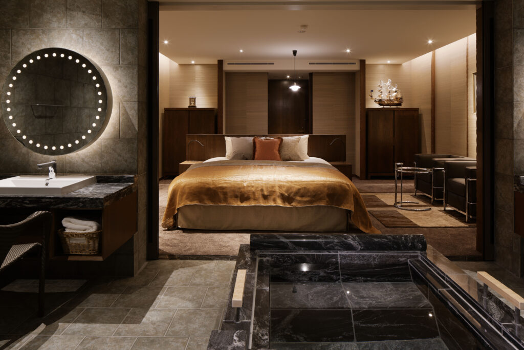 キングサイズのベッド、座り心地の良いチェアに御影石のバスタブが備えられています。