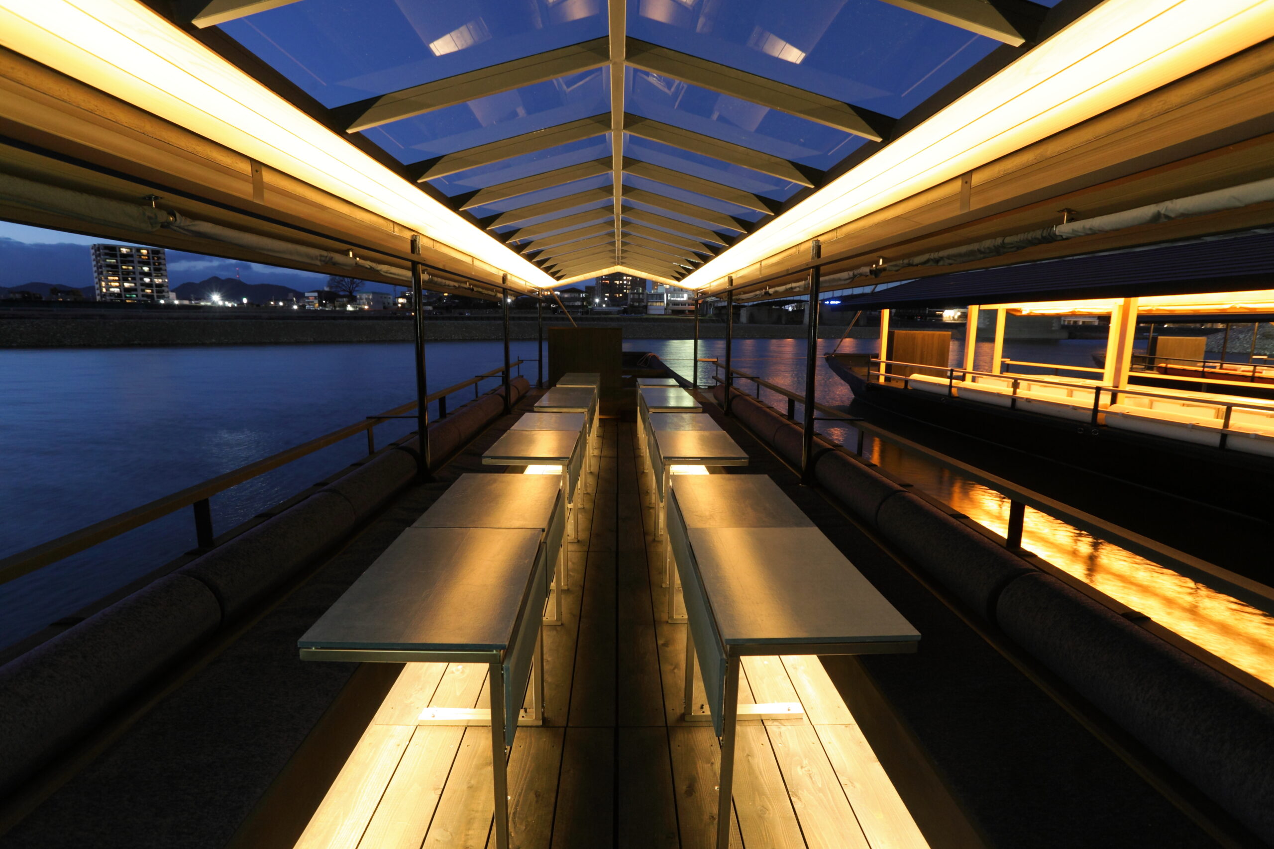 2022年にデビューした貸切専用の特別仕様船で、今までにない快適な鵜飼鑑賞を。岐阜の画家・加藤東一の作品をモチーフにした洗練された内装に、ゆったりとしたソファやテーブルを完備。靴を脱がずに、柔らかな間接照明に包まれたラグジュアリーな空間から、幻想的な長良川鵜飼の世界をお楽しみいただけます。
